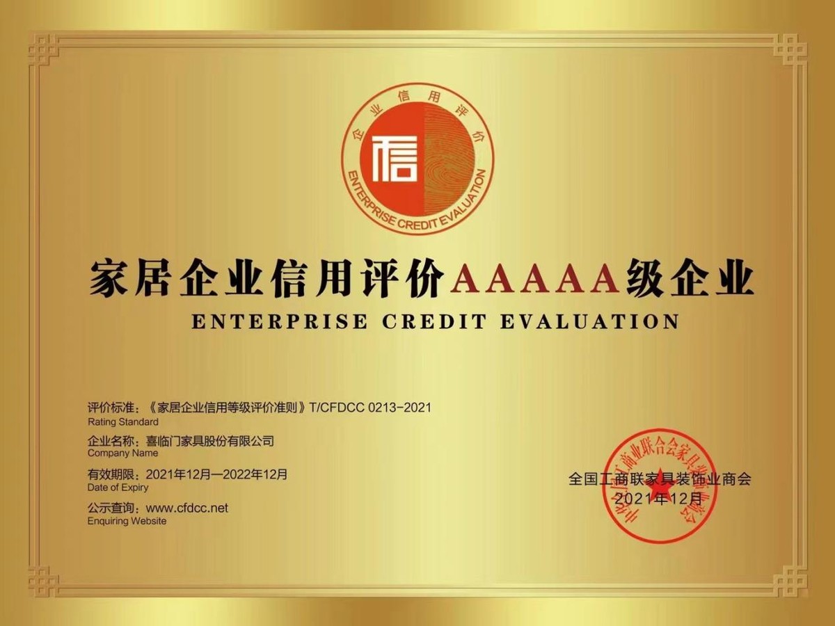 1月5日,由全国工商联家具装饰业商会主办的2021中国家居业领军企业家年会在广州召开,喜临门家具股份有限公司获评“家居企业信用评价AAAAA级企业”、“家居产品质量评价五星级企业”两项家居行业最高荣誉。