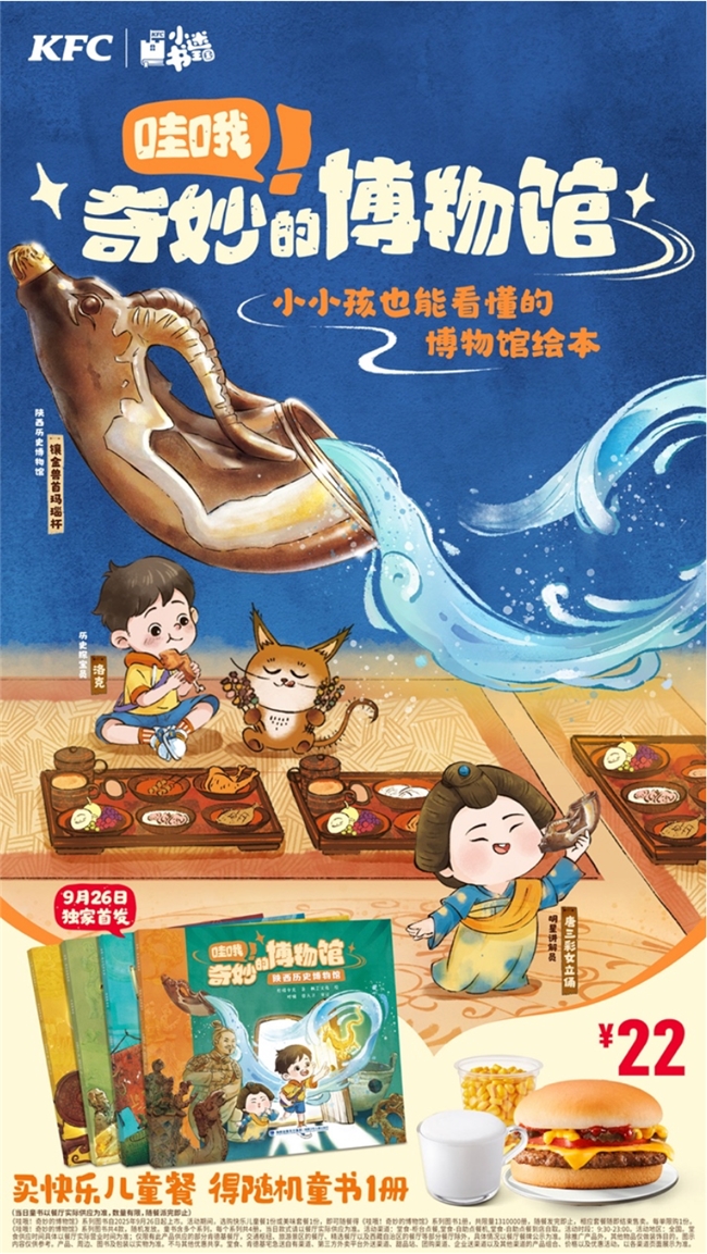 肯德基全国首发的图画书《哇哦!奇妙博物馆》是一套专为儿童打造的文博科普读物——在书中,主人公“洛克”带领读者走进河南、陕西、湖北、湖南四个省级博物馆。通过与当地“活文物”讲解员的跨时空奇妙互动,沉浸式探寻每个博物馆的丰富宝藏。“洛克”在四大博物馆,分别巧遇了四位”活文物“讲解员:唐妮儿、小尊、楚伢和狸宝,他们大有来头,都是博物馆里的镇店之宝。在他们的陪伴下,洛克作为小朋友的“代言人”大胆发问,从河南博物院的华夏古乐,到陕西历史博物馆的大唐气象,再到湖北省博物馆的越王勾践剑,以及湖南省博物馆的辛追夫人传奇……让读者看懂文物细节,深入了解文物背后故事,快速延展文博知识。