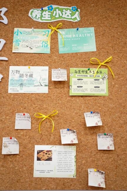 一旁的“邻里智多星”互动墙,则成为了社区居民共享健康智慧的聚集地。大家纷纷将“小雪节气宜早睡晚起”“冬日食萝卜赛过小人参”等口口相传的“老底子”养生经验写成便签分享。