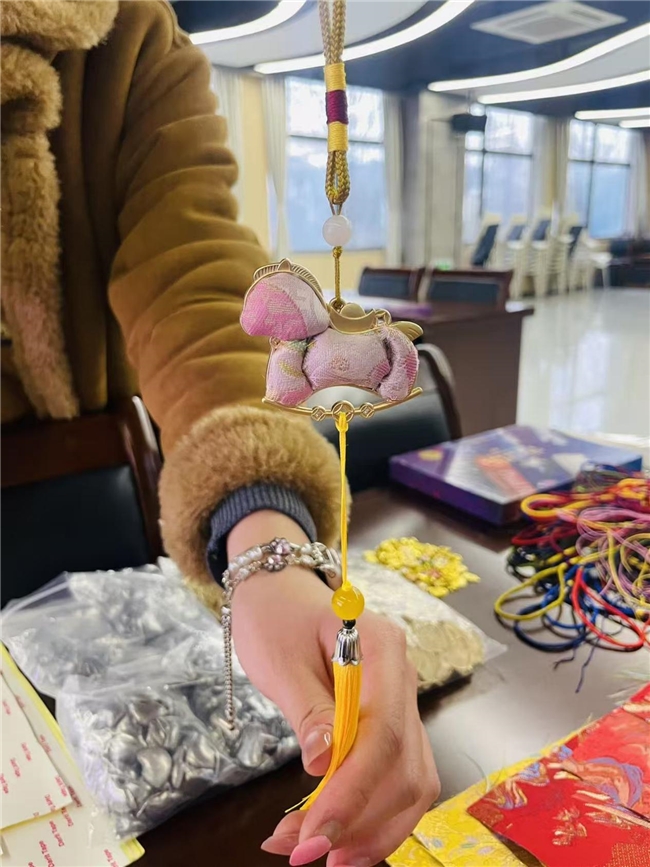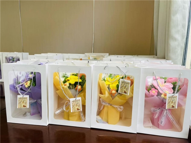 活动围绕三大篇章徐徐展开。在“匠心传承·指尖造物”环节,参与者们在手作老师和社区达人的指导下,亲手制作宋锦小马挂坠,在一针一线中感受非遗文化的匠心之美。“邻里有光·赠予芬芳”环节,社区钩针达人亲手编织的手工花束在现场悄然“绽放”,将芬芳与敬意献给每一位平凡而闪耀的“她”,也让“人人皆可参与公益”的理念在指尖流动。